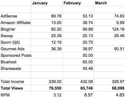 Sovrn: I have this to say about Sovrn: meh. Pinch of Yum and other large blogs/websites have a lot of success with this advertising network (which is similar to Google Adsense, but it’s CPM so it pays per impression). I’m no expert, but I think it’s not the best network to use for small blogs, which is why I stopped using it after February. If/when Bowl of Delicious gets bigger, I’ll try it again and report back to you! (UPDATE 9/25/15: In response to a reader’s comment below, I decided to give Sovrn another try. I’ve figured out a few things about it and am extremely happy I did! Stay tuned for the next income report to find out how!)