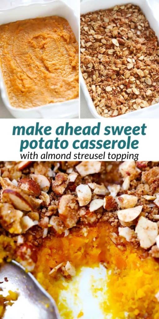 This Sweet Potato Casserole recipe is easy to make ahead of time up to three days! It’s topped with the most deliciously crunchy almond streusel topping, with NO marshmallows. And it’s not too sweet – this recipe uses only a little bit of maple syrup and brown sugar, and plenty of butter, with vanilla and cinnamon for extra flavor.