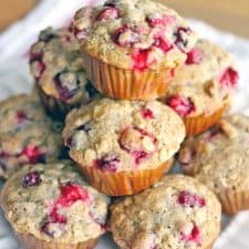 They are, however, extremely tart on their own. Ever tried eating a raw cranberry straight up? I would recommend against it, based purely on taste. This is why this muffin recipe has more sugar than I would usually add, since I try and stay away from refined sugar. I think these muffins would be great with honey instead of brown sugar (like in my banana blueberry oat muffins recipe). If you try it out, let me know how it is in the comments below!