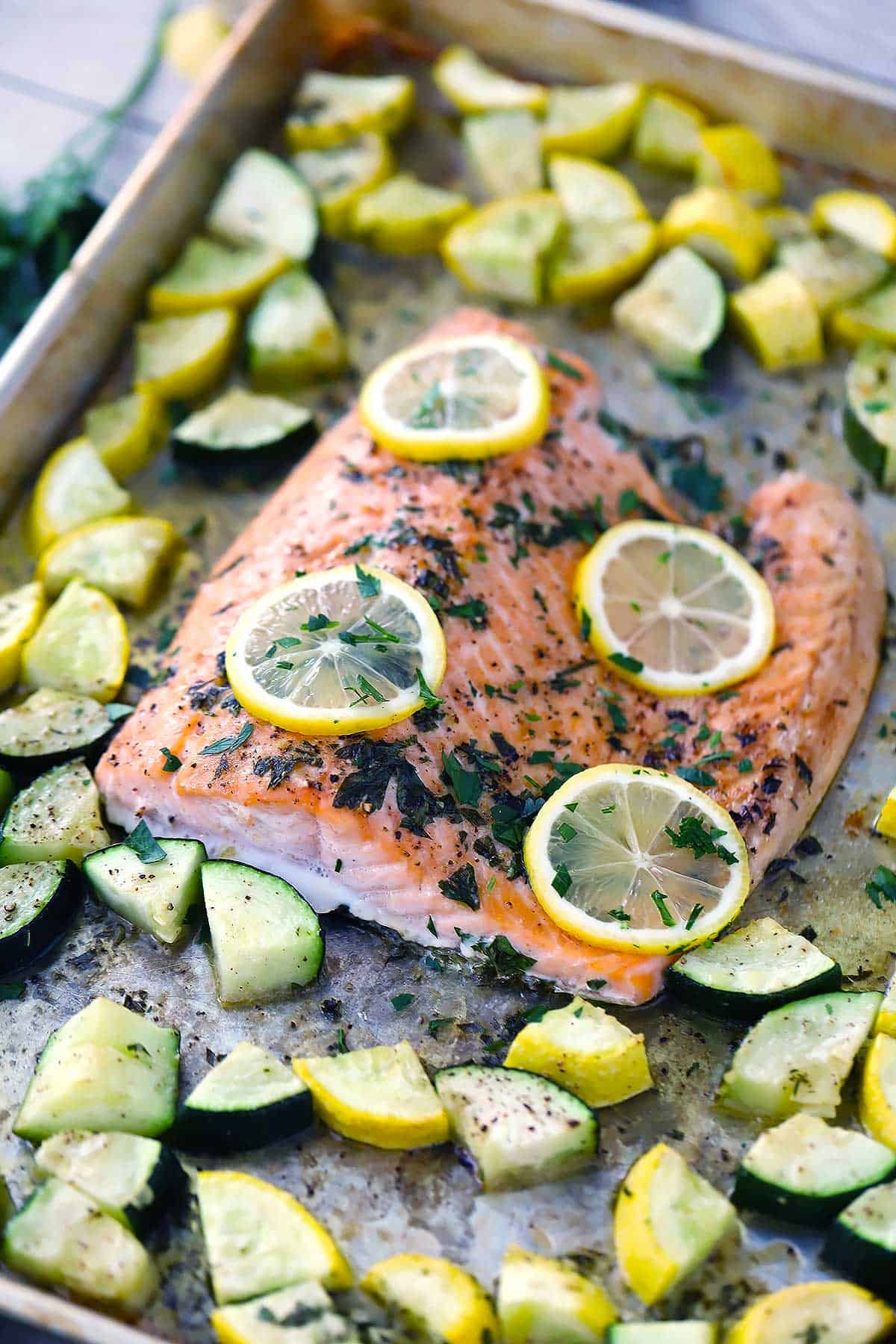 The salmon cooks perfectly every time. It’s ultra-moist and flakes apart perfectly. Zucchini and summer squash are quick-cooking vegetables, so everything cooks for only 20 minutes all at once with only 5 MINUTES of ridiculously easy prep!