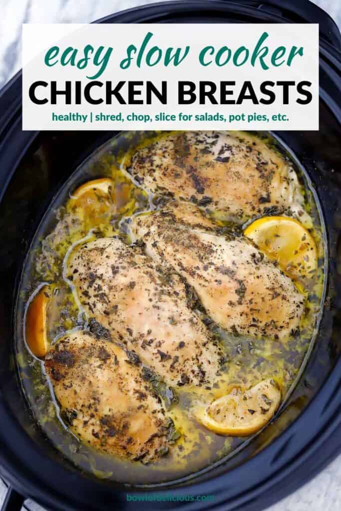 This Slow Cooker Chicken Breasts recipe is a great way to cook simple, basic chicken breasts that are tender and juicy, flavorful, and SO easy and hands off to make! They’re perfect on their own, or to use in chicken salad, soups and stews, sandwiches, and more. These crockpot chicken breasts are flavored with lemon and oregano and can be sliced, chopped, or shredded for all kinds of uses.