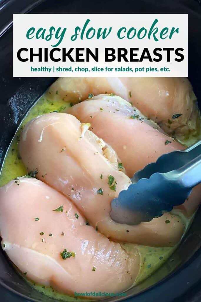 Cooking chicken breasts in your slow cooker is so easy, and you don’t even need to touch the raw chicken with your hands! Just use tongs to transfer it in along with some herbs, lemon, and broth, then set it and forget it.