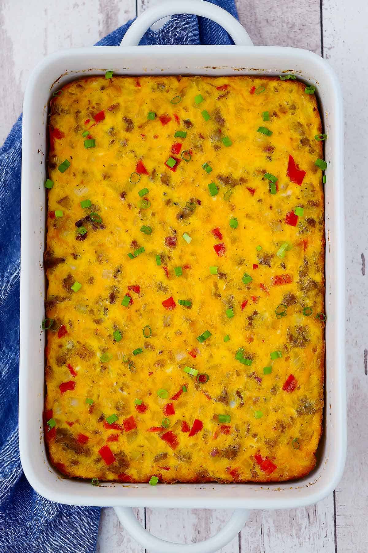 - At this point, you can bake right away or cover with foil and refrigerate (for up to 48 hours). When you are ready to bake, cook it at 350 degrees on the center rack for about 45 – 55 minutes, or until the casserole is set and doesn't jiggle when you shake it (it will take on the longer side of things if it's cold out of the fridge). Allow the casserole to cool for 5-10 minutes before slicing it into 12 pieces and serving. Garnish with sliced green onions, if desired.