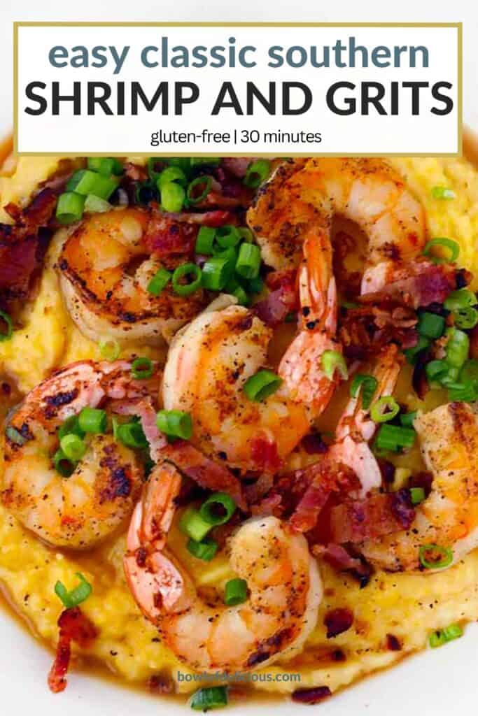 The shrimp is cooked in bacon fat and then mixed with a simple buttery sauce, then served on top of the grits with crumbled bacon and green onions. It’s so insanely delicious!