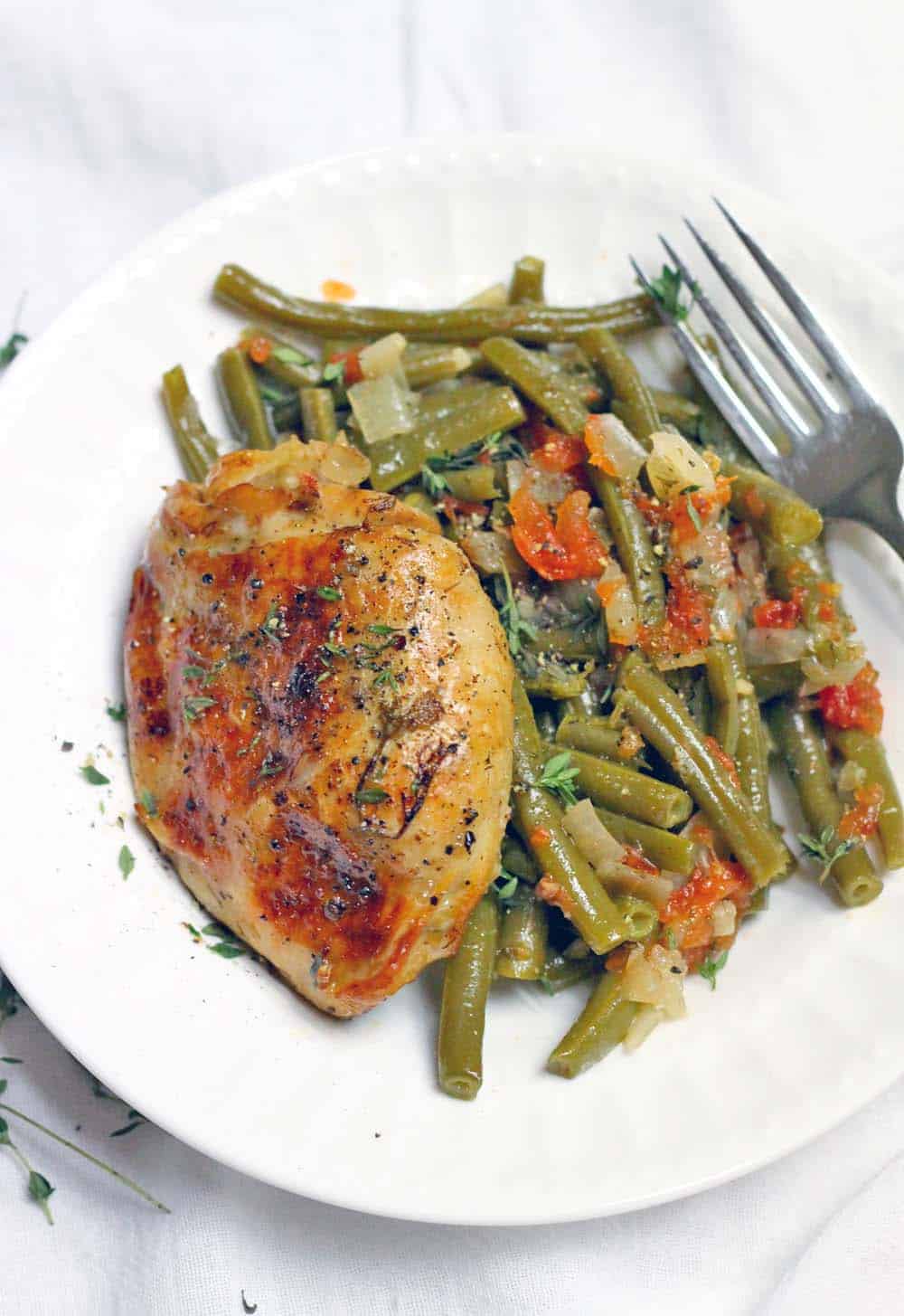 This recipe has been a staple in our household for years! It is SUPER forgiving and delicious. I’ve made it with fresh green beans, frozen green beans, canned tomatoes, fresh tomatoes, fresh dill, dried dill – basically every variation of the ingredients possible and it always turns out great. The chicken is so tender it comes right off the bone. I definitely recommend broiling the chicken for a few minutes after it’s done – crispy chicken skin is the best.