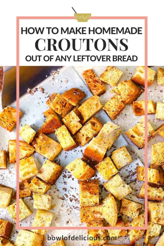 I love making these croutons from leftover no knead bread, focaccia, or even dinner rolls.