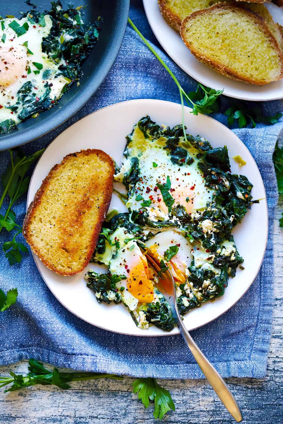 - Serve with toasted crusty bread if desired and season with more salt and pepper if needed. I like to drizzle the eggs and spinach with a little more olive oil and sprinkle some crushed red pepper on when serving.