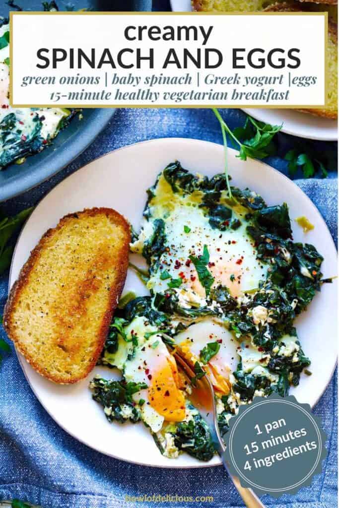 This creamy spinach and eggs features only four main ingredients – green onions, baby spinach, Greek yogurt, and eggs – and takes only 15 minutes to make in one pan! Greek yogurt is used instead of cheese or heavy cream to give the consistency of a creamed spinach in a lighter, healthier way. Eggs are cracked directly into the creamy spinach mixture and cooked right in the pan. This is such an easy way to get healthy greens in for breakfast, but this meal is great any time of day especially for a fast dinner!