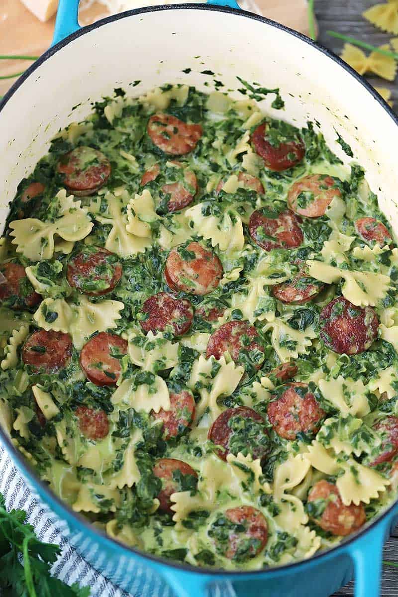 This recipe features smoked sausage (any kind, but I used a super yummy chicken andouille sausage to make it a bit lighter), frozen chopped spinach, and farfalle pasta, with parmesan cheese and heavy cream stirred in at the very end to make a creamy, luxurious sauce that melts into every bite.