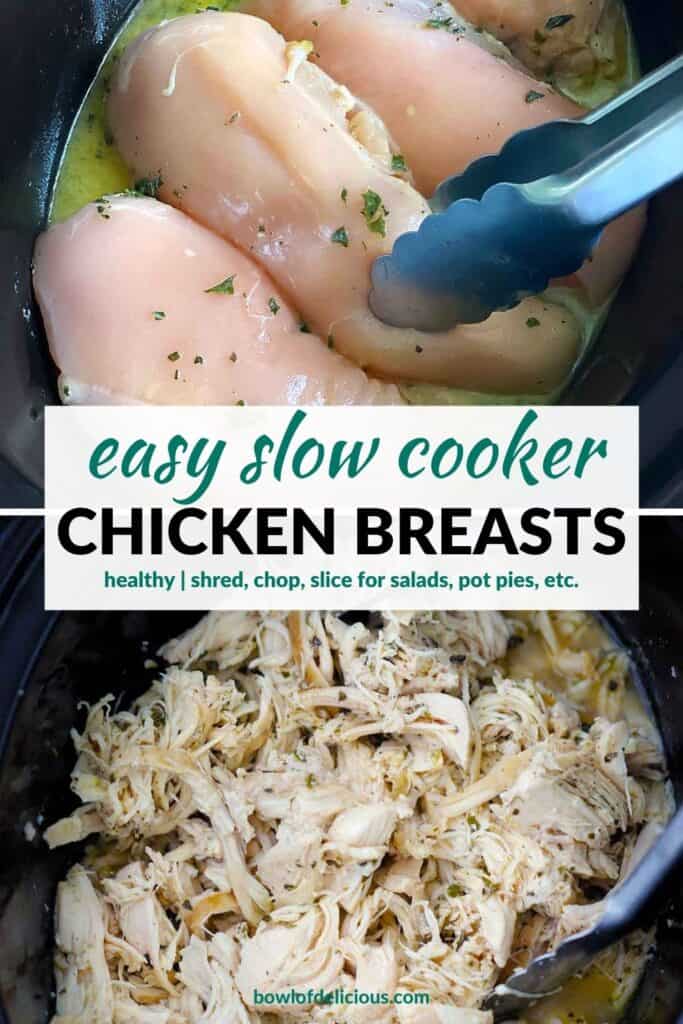 Cooking chicken breasts in your slow cooker is so easy, and you don’t even need to touch the raw chicken with your hands! Just use tongs to transfer it in along with some herbs, lemon, and broth, then set it and forget it.