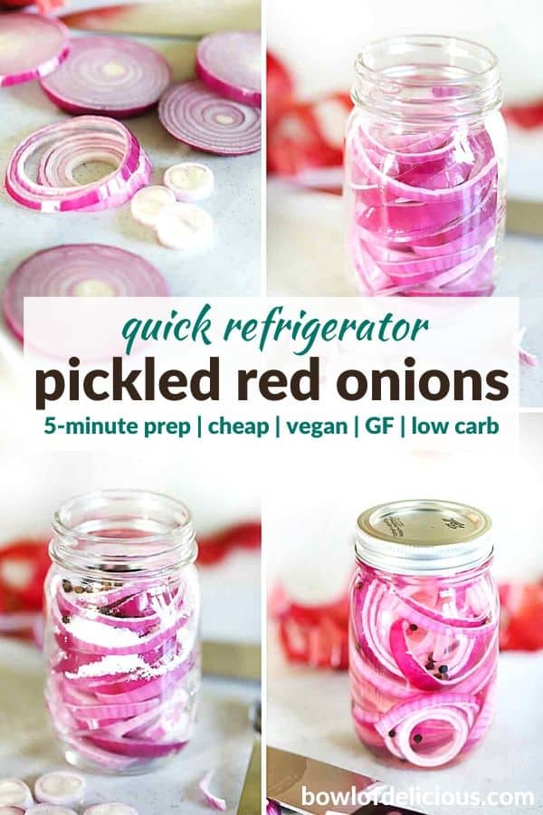 These pickled red onions first appeared on a Bowl of Delicious recipe for crispy brussels sprouts with pickled red onions. I had multiple readers contact me saying they used the recipe JUST for the onions, so I thought I’d share them on their own!
