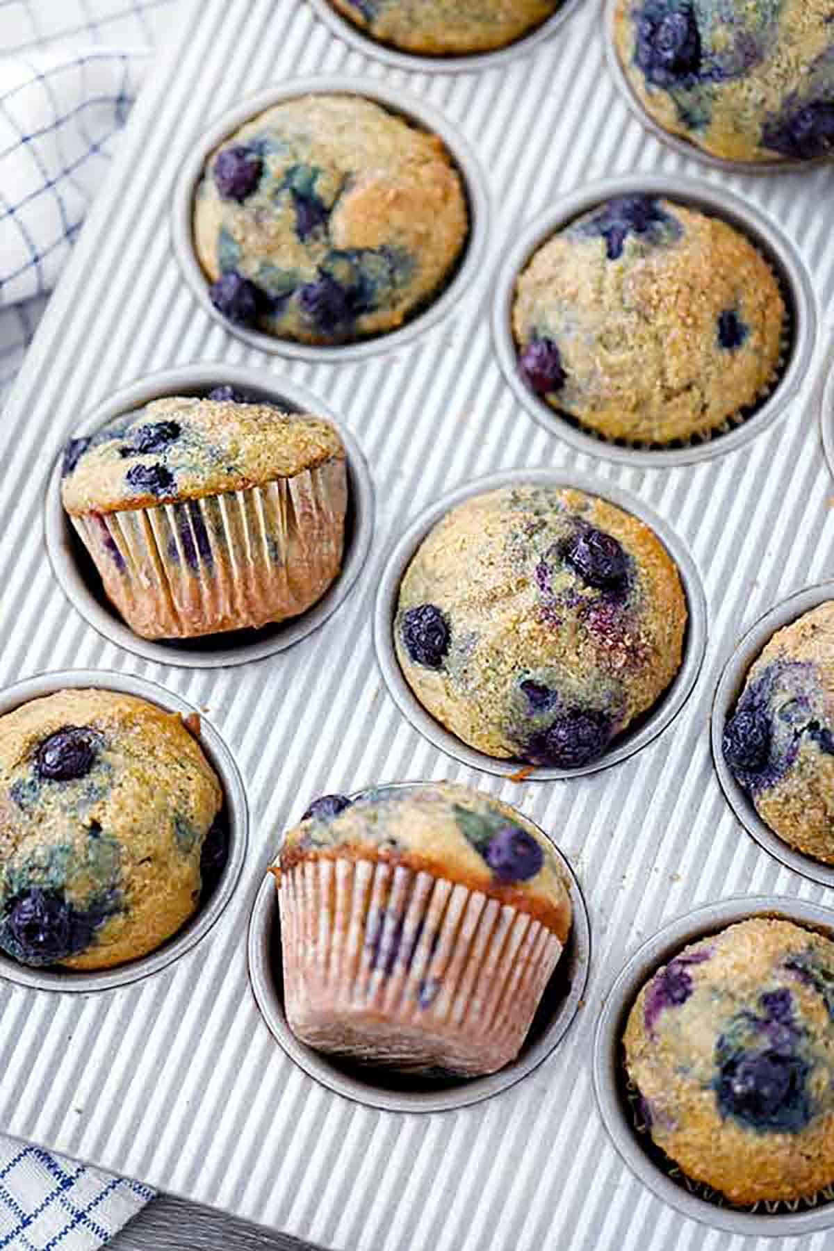 - To make muffins "pretty" with whole, visible blueberries on top, save 1/2 cup of blueberries to add on top of muffins after you've scooped the batter into the pan. Then, sprinkle with turbinado sugar and bake!