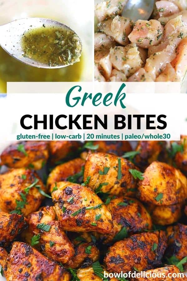 These Greek Chicken Bites seasoned with lemon, garlic, and oregano are little flavor-packed nuggets that you’ll want to use for everything! Add to a salad, wrap in a flatbread for a gyro sandwich, serve as a main course, or eat them on their own dipped in yogurt sauce. They take 20 minutes to make, 5 ingredients, and they’re a versatile low-carb, paleo/whole30 compliant recipe!